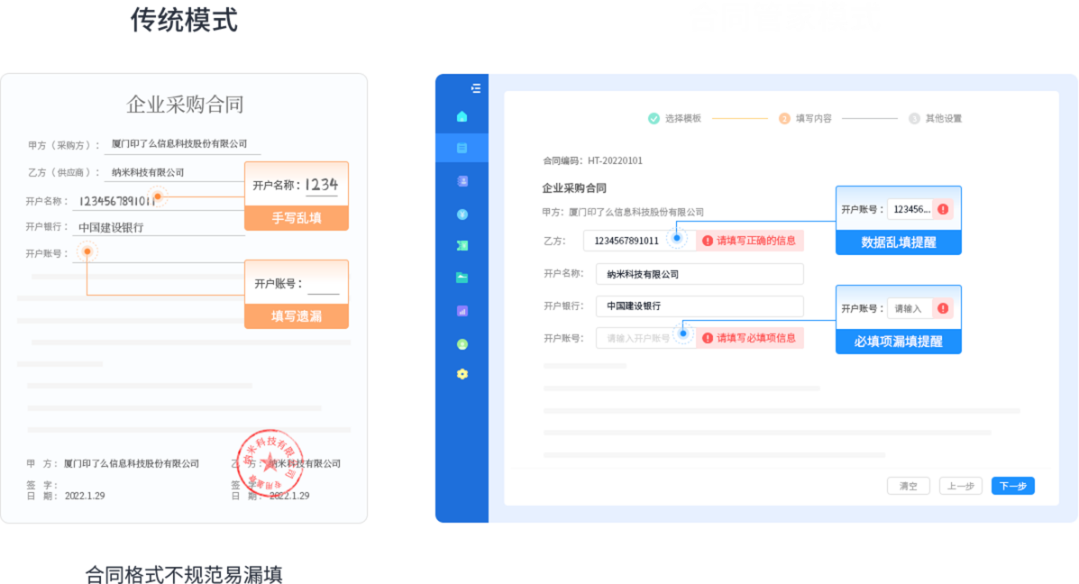 难点:传统的合同管理中,风险查阅及大量的重复性的录入工作,都依靠人工来完成,工作量巨大